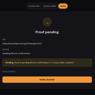 For web archive requests, the submitted public URL is sent to the BitProof API so the server can capture screenshot, HTML, and PDF artifacts and generate the archive proof bundle.